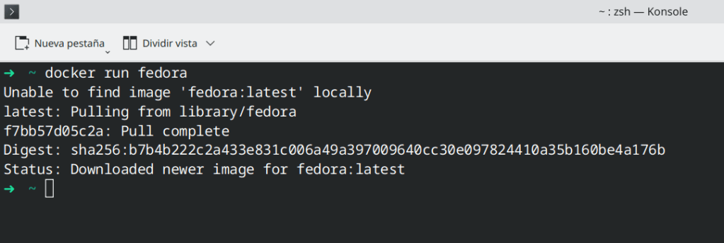 Automáticamente se va a descargar el contenedor de la distribución de Gnu/Linux “Fedora”. Dicha distribución contiene todo lo necesario para ejecutar programas dentro de ella.