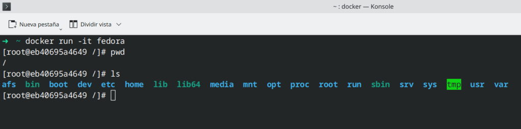 Al ejecutar el anterior comando estamos por fuera del proceso principal, accedemos a un shell “bash” que se ejecuta dentro de Fedora, pero que al salir no se cerrara el contenedor.