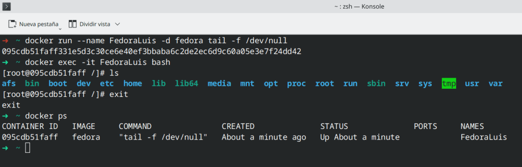 $ docker run --name FedoraLuis -d fedora tail -f /dev/null